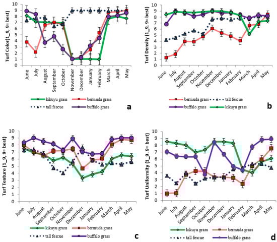 Figure 3. Monthly changes in color (a), density (b), texture (c), uniformity (d) in turfgrass species. Visual merit scores (1 = poorest, 9 = best) were measured according to NTEP, and during summer, autumn, winter 2015, and spring 2016. Error bars represent ± 1 standard error.
