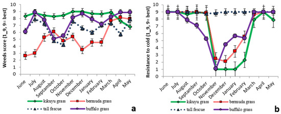 Figure 4. Monthly changes on weed attack score (a), cold resistance (b), in turfgrass species. Visual merit scores (1 = poorest, 9 = best) were measured according to NTEP and during summer, autumn, winter 2015, and spring 2016. Error bars represent ± 1 standard error.