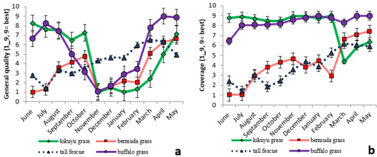 Figure 5. Monthly changes in general quality (a), coverage (b) in turfgrass species. Visual merit scores (1 = poorest, 9 = best) were measured according to NTEP, and during summer, autumn, winter 2015, and spring 2016. Error bars represent ± 1 standard error.