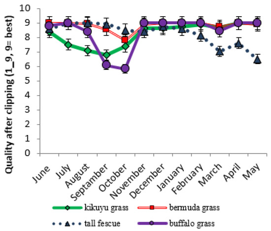 The mean quality after clipping was the lowest in tall fescue grass compared to the other turfgrasses, and buffalo grass had the best performance. According to Figure 6, among the seasons, autumn was the season in which the turfgrasses had the lowest quality after clipping.
