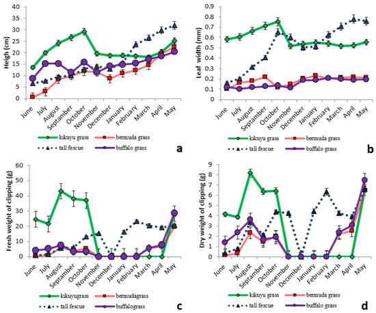 Figure 7. Monthly changes on height (a), leaf width (b), fresh weight of clipping (c), and dry weight of clipping (d) in turfgrass species. Visual merit scores (1 = poorest, 9 = best) were measured according to NTEP, and during summer, autumn, winter 2015, and spring 2016. Error bars represent ± 1 standard error.