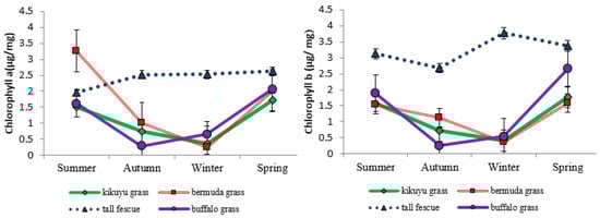 Figure 8. Interaction effect between the season and turfgrass types on chlorophyll a (left) and chlorophyll b (right). Error bars represent ± standard error.