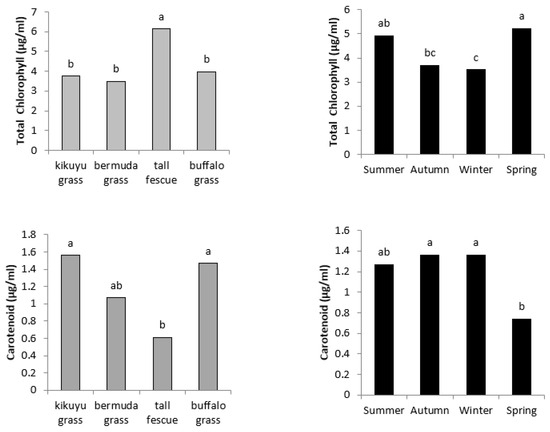 Figure 9. Differences in total chlorophyll and carotenoid contents of the examined turfgrass species in four seasons. The same letters indicate no significant differences at the probability level (p ≤ 0.05) based on the Tukey test (a to c represents the highest and the lowest total chlorophyll and carotenoid contents, respectively).