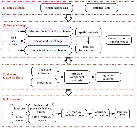The flowchart is shown in Figure 2, and the specific methods used are introduced below. The remote sensing data and statistical data were initially preprocessed in this study, encompassing radiometric calibration, atmospheric correction, etc. Subsequently, an analysis was conducted to examine the changes in land cover within Tianjin, including variations in area, frequency, intensity, etc. Following this analysis, 19 driving force indicators were selected for further investigation. Finally, a prediction model was employed to investigate the land-use patterns in Tianjin.