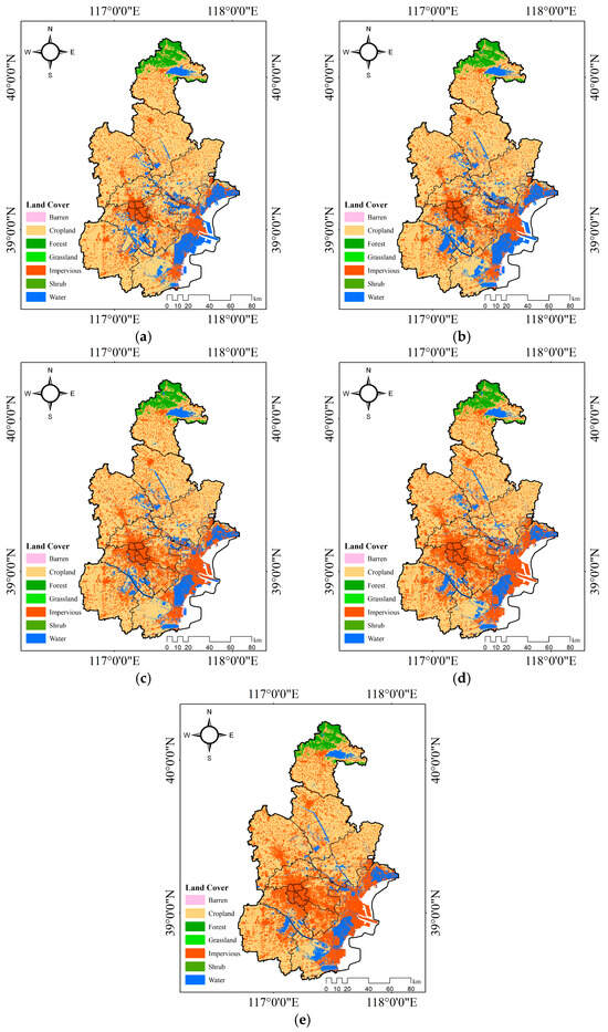 Land cover in Tianjin. (a) Land cover in Tianjin, 2000. (b) Land cover in Tianjin, 2005. (c) Land cover in Tianjin, 2010. (d) Land cover in Tianjin, 2015. (e) Land cover in Tianjin, 2020.