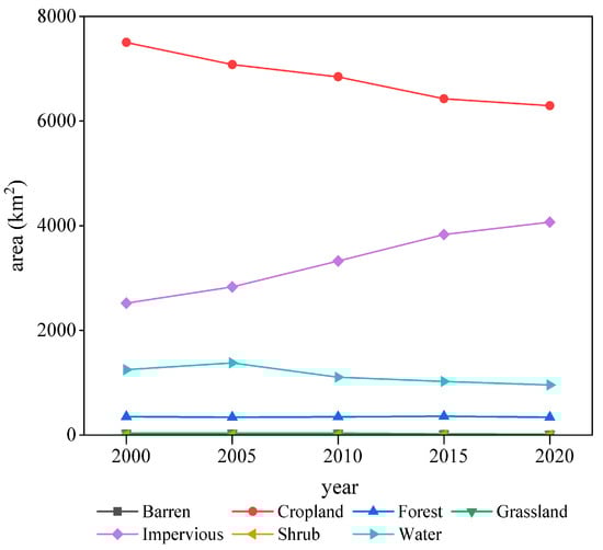 Utilizing the classification outcomes of remote sensing images, this study quantified the areas of different land-cover types in Tianjin for the years 2000, 2005, 2010, 2015, and 2020, as depicted in Figure 3 and detailed in Table 1. Additionally, the percentage of each land-cover area is presented in Table 2. According to these tables, the land-cover types in Tianjin, ranked from the largest to smallest areas, are cropland, impervious surfaces, water, forest, grassland, barren land, and shrubland. These types have an average proportion of 58.45%, 28.38%, 9.79%, 2.98%, 0.2485%, 0.16%, and 0.0005%, respectively. It is evident that cropland is the predominant land-use type in Tianjin, followed by impervious surfaces, while the areas of other land types are relatively small, each constituting less than 10% of the total land use.