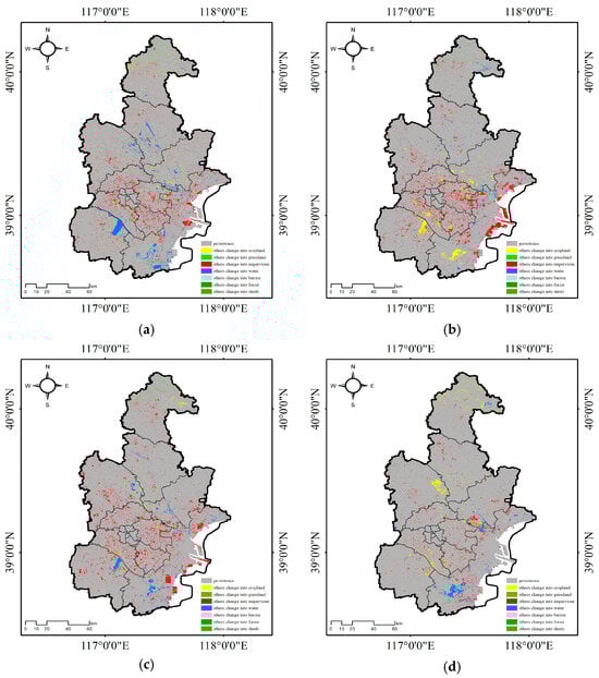 Matrix of land transfer in Tianjin (2000~2020). (a) Transfer matrix for 2000–2005. (b) Transfer matrix for 2005–2010. (c) Transfer matrix for 2010 to 2015. (d) Transfer matrix for 2015–2020.