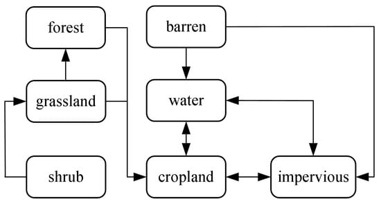 Synthesizing the analysis presented earlier, Figure 6 delineates the principal directions of land-cover-type transfers in Tianjin, elucidating the underlying patterns in these changes. The predominant transfer trends in Tianjin’s land-cover types are as follows: (1) water predominantly transitioned to cropland and impervious surfaces; (2) barren land mainly transformed into water and impervious surfaces; (3) cropland was primarily converted into impervious surfaces and water; (4) forest areas were largely transferred to cropland; (5) grassland mainly transitioned to cropland and forests; (6) shrubland was primarily converted into grassland; (7) impervious surfaces predominantly changed into water. These trends are closely aligned with the urban development and land-management policies implemented in Tianjin in recent years.