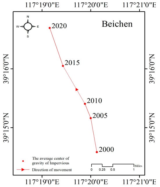 The results indicate that from 2000 to 2020, the center of gravity of Tianjin’s impervious surfaces, located in the Beichen District, shifted northwestward. Specifically, from 2000 to 2005, the center of gravity moved 1.0971 km northwest, at a rate of 0.2194 km/year. Between 2005 and 2010, it moved 0.4889 km northwest, at a rate of 0.0978 km/year. From 2010 to 2015, the movement was 1.3693 km northwest, at a rate of 0.2739 km/year. Finally, from 2015 to 2020, it shifted 1.2759 km northwest, at a rate of 0.2552 km/year. Overall, this indicates a consistent northwestward shift of the center of gravity of impervious surfaces in Tianjin, with a total distance of 4.1992 km and an average movement rate of 0.8398 km/year.