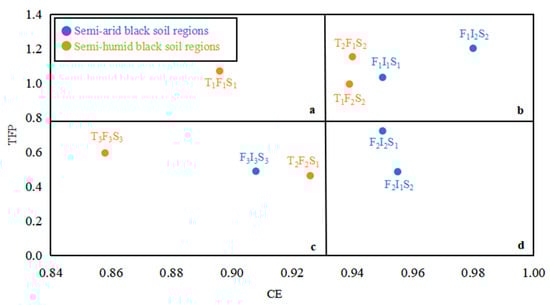 - According to the efficiency evaluation matrix of orthogonal experimental groups for cleaner production of maize cultivation in black soil regions, the integrated technical efficiency and total factor production efficiency of test group F1I2S2 in semi-arid black soil regions and test group T2F1S2 in semi-humid black soil regions were relatively optimal.