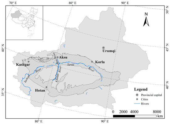 The study area is the area of the Circum-Tarim Basin (74°18′5″ E~91°24′1″ E, 35°59′24″ N~42°1′34′ N), with the Tianshan Mountains, Alshan Mountains and Kunlun Mountains in the north, northeast and southwest, respectively. This region is located in the continental arid climate zone, with hot and dry weather, average temperature 10.7 °C, large annual and daily temperature differences, scarce precipitation (average annual average 17.4~42.8 mm), and high evapotranspiration intensity (1800~2900 mm), which is prone to desertification [49]. The altitude range of the study area is 702 m~3526 m, and the total area is 3.294 × 107 ha. The Circum-Tarim Basin is the main population distribution area in southern Xinjiang, with several important distributing rivers, such as Aksu River, Tarim River, Khotan River, and Yarkant River, and it is also a major development area for industry and agriculture. The total area of the study area is 32.94 × 104 km2. The location diagram of the research area is shown in Figure 1.