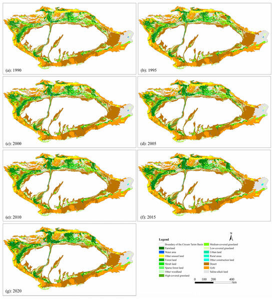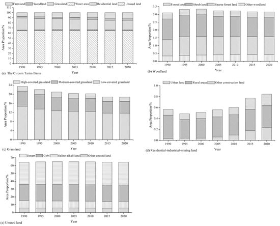Tarim Basin is a typical arid area, and the spatial distribution of LULC types is closely related to the distribution of water resources. Farmland and residential–industrial–mining land (abbreviated as residential land) are mainly distributed in oasis areas formed by several major rivers and several distribution areas of the Xinjiang Production and Construction Corps. Grassland is mainly distributed at the edge of oases and on both sides of rivers, while unused land is heavily distributed at the edge of deserts and areas lacking water resources. During the period of 1990–2020, unused land and grassland were the main LULC types in the Circum-Tarim Basin, and the average proportions were 64.69% and 20.61%, respectively, followed by farmland (9.70%) and woodland (3.21%). The water area and the residential land were the smallest ones. In grassland, low-covered grassland (61.79%) comprised the largest area, followed by medium-covered grassland (28.25%), and high-covered grassland (9.96%). Woodland was mainly composed of shrub (20.61%) and spare forest land (35.98%). Residential land was mainly covered by rural areas (62.89%) and urban land (22.82%). Unused land was mainly covered by desert (44.96%), gobi (32.39%), and saline–alkali land (13.74%) (Figure 3).