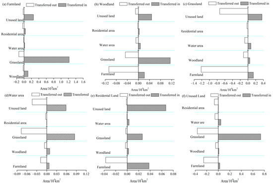 For the transfer situation between different LULC types, the results showed that farmland and residential land were mainly transferred in, while grassland was mainly transferred out (Figure 5). The area transferred to farmland mainly came from grassland (1.22 × 104 km2, accounting for 74.51%), unused land (0.25 × 104 km2, accounting for 15.56%), and woodland (0.11 × 104 km2, accounting for 7.62%) (Figure 5a). In woodland, the sizes of the areas transferred in and out were 0.19 × 104 km2 and 0.18 × 104 km2. Woodland was mainly transferred into farmland (60.59%) and grassland (26.93%) (Figure 5b). Grassland was mainly transferred out to farmland (55.90%) and unused land (33.72%); the types that were transferred in were also mainly unused land (57.70%) and farmland (22.21%) (Figure 5c). Unused land mainly transferred out to grassland (46.04%) and farmland (32.09%), while the type that was transferred in was mainly grassland (89.96%) (Figure 5f). Overall, the increase in farmland was mainly due to the occupation of grassland, unused land, and woodland, especially, the occupation of low-covered grassland, medium-covered grassland, and saline–alkali land.