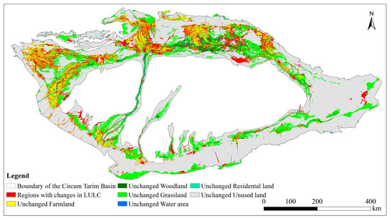 The mutual conversion between various LULC types could not only characterize land development activities and socio-economic development in the Circum-Tarim Basin, but also had a close relationship with desertification control. Therefore, in order to clarify the spatial characteristics of LULC changes from 1990, this study defined an area where a certain LULC type had no change in 6 periods as an unchanged region (Region I), and otherwise, it was defined as a changed region (Region II).