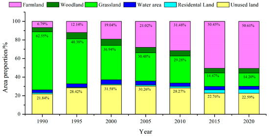 The composition and changes in area proportion of LULC during the period 1990–2020.