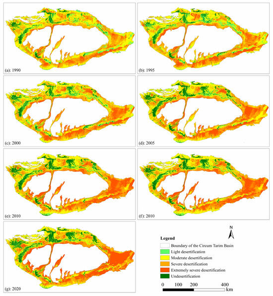 The spatial distribution of desertification degree in the Circum-Tarim Basin during the period of 1990–2020.