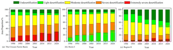 In the Circum-Tarim Basin, the no-desertification area gradually increased by 2.10 × 104 km2 cumulatively, and the area proportion increased from 6.70% to 11.91%. The desertification area gradually decreased correspondingly. During the period of 1990–2020, the area of light, moderate, and severe desertification decreased by 9.99 × 104 km2 cumulatively; however, the extremely severe desertification area increased by 7.89 × 104 km2. The area size order (from large to small) changed from moderate (38.43%), severe (33.40%), light (16.65%), and extremely severe in 1990 to extremely severe (29.95%), moderate (27.41%), severe (25.65%), and light (16.99%) in 2020 (Figure 9, Table 7). Desertification during the period of 1990–2020 was characterized by an overall improvement and local deterioration, and the internal composition structure of desertification land underwent changes.