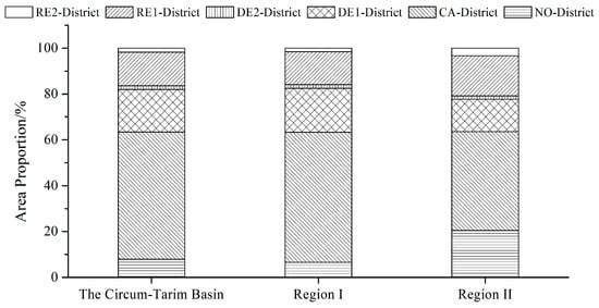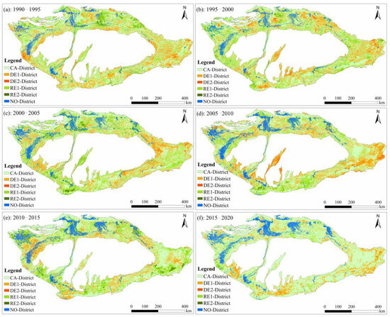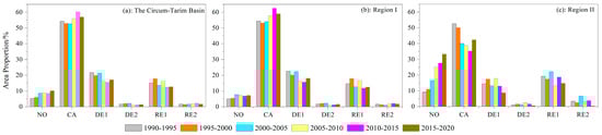 In the Circum-Tarim Basin, the order of desertification development from large to small was CA (multi-period average 55.49%), DE (20.22%), RE (16.40%), and NO (7.89%). There was little difference in the area proportion between Region I and the basin. In Region II, the area proportion of SA was still the largest one (43.14%), but the area proportions of RE (20.88%) and NO-District (20.45%) became evidently larger. The area proportion of DE was the smallest (15.53%). Overall, the desertification development in the Circum-Tarim Basin presented an overall stable trend, with both degradation and reversion coexisting. There were differences in Region I and Region II; CA and DE dominated in Region I, while CA and RE dominated in Region II, and NO-District accounted for a larger area proportion in Region II than that in Region I (Figure 11). Temporally, the development of desertification in the Circum-Tarim Basin was mainly characterized by an increase in the area of CA and a reduction in the DE and NO-District areas. The area of CA increased by a total of 2.41 × 104 km2, of which 81.46% occurred in Region I, and 18.54% occurred in Region II. The total area of DE decreased by 1.60 × 104 km2, of which 87.34% occurred in Region I, and 12.66% occurred in Region II. The total area of NO-District area decreased by 0.81 × 104 km2, of which 69.88% occurred in Region I, and 30.12% occurred in Region II.