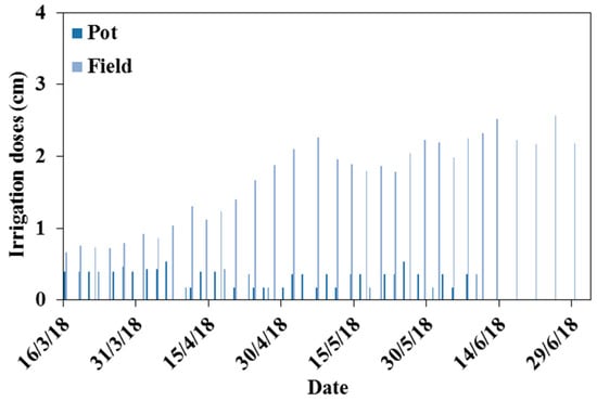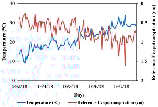 Surface irrigation was used to deliver water to each individual tomato plant. The irrigation scheduling in the pot and field experiments, mean temperatures, and reference evapotranspiration are presented in Figure 1. No rainfall events were recorded during the tomato growing season. In the field experiments, irrigation was applied every three or four days based on 100% of estimated evapotranspiration (Figure 1). In the pot experiments, irrigation was applied every two or three days until the soil water content reached field capacity (34% in terms of the volumetric soil water content). Soil field capacity was measured using a pressure plate apparatus (for a pressure head of −300 cm). The amounts of water added were recorded for each pot (Figure 1). The average wetted area was 45% in the field experiment and 65% in the pot experiment. Irrigation water provided to the plants had three different qualities: distilled water with a salinity of 0 dS/m, saline water with a salinity of 3.5 dS/m, and saline water with a salinity of 7 dS/m. Volumetric soil water content was measured using the gravimetric method, and soil salinity was measured using the saturated paste extract method [] with three replicates. In the pot experiment, soil samples were taken every ten days until the end of the tomato plant cycle to characterize soil water and soil salt content. In the field experiment, the soil water content was measured on days 1, 30, 60, and 109 after planting every 20 cm down to a depth of 80 cm.