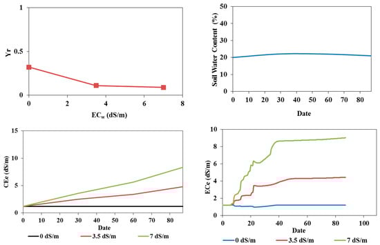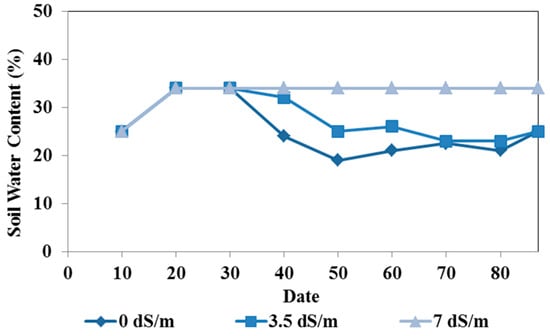 The variations in the soil water content in the pot experiments are presented in Figure 2. During the first month after the start of irrigation, the water content gradually increased to reach the field capacity (34%) in all three pots irrigated with different water qualities [,,]. The water content of the soil irrigated with the saltiest water (7 dS/m) remained at the field capacity. As the soil salinity increased with frequent irrigations, osmotic pressure also increased, preventing root water uptake. Irrigations with the other two water qualities did not block water extraction by the plant roots, and the soil water content decreased over time. The soil irrigated with fresh water (0 dS/m) had the lowest water content values, as the plant roots extracted water without any osmotic potential constraints.