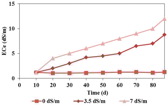 Soil salt content (ECe) in the pot experiments irrigated with waters of different salinities (0, 3, and 7 dS/m).