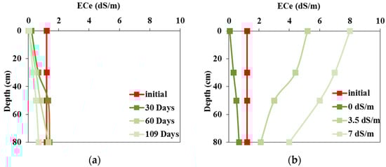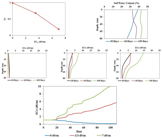 In the field experiment irrigated with fresh water, the variations in the soil salinity profiles measured every thirty days indicated continuous leaching of the initial salinity (Figure 5a). In contrast, surface salinity significantly increased during irrigations with saline waters of 3.5 dS/m and 7 dS/m, reaching 7 dS/m and 12 dS/m, respectively, at the end of the crop cycle (Figure 5b). Soil salinity is higher near the surface than at depth, mainly due to evapotranspiration causing salt accumulation near the soil surface [].