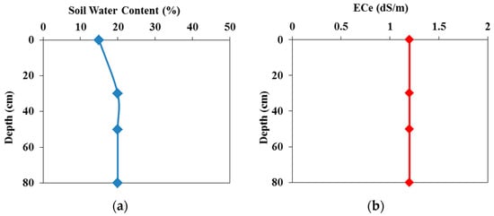 The dispersivity of the different soil layers varied around 5 cm, except for the 60–80 cm layer, where it was equal to 3 cm. The distribution coefficient of the adsorption isotherm ranged between 0.1 g/cm3 and 0.3 g/cm3 for all soil layers. Hydrus-1D includes a database that provides stress response function values for many crops, including tomatoes, which were considered here. The initial soil water content and soil salinity values as a function of depth in the field experiment are shown in Figure 6. In the pot experiment, the initial water content was 20%, and the initial soil salinity was 1.2 dS/m.