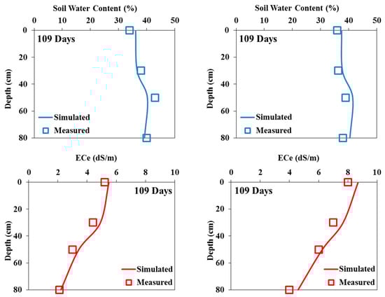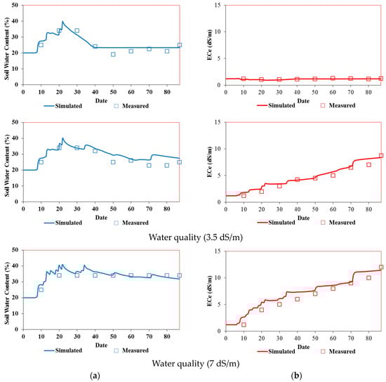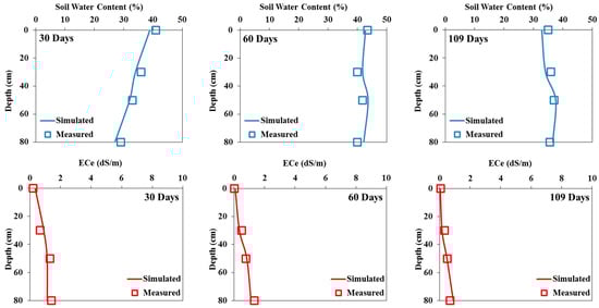 The Hydrus-1D model was calibrated using measured soil water content and salinity profiles in both pots and field experiments irrigated with fresh water (i.e., 0 dS/m). The measured and simulated water content and salinity values for both experiments are presented in Figure 7, Figure 8 and Figure 9. The measured soil water content values are quite close to the simulated values. In the field experiment (Figure 7 and Figure 8), the Hydrus-1D model underestimated the measured water content on day 30 and overestimated it on the other output dates. The model slightly overestimated the volumetric water content in the pot experiment (Figure 9).