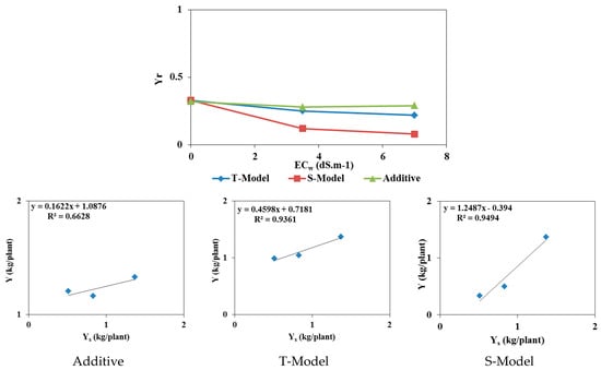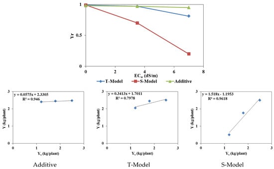 The effect of saline irrigation water on tomatoes’ relative yield (Yr) [−] (top) and the relationships between the actual (Y) and simulated (Ys) yields (kg/plant) (bottom) using the three stress response models (Additive, T-Model, and S-Model) incorporated in Hydrus-1D (field experiments).