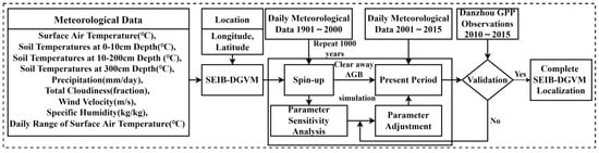 SEIB-DGVM is a mechanism process model that simulates the interactions between individual plants. Driven by meteorological and soil data, the model simulates local interactions among individual plant organisms in a constructed virtual forest, including growth, competition, and death under shaded conditions influenced by light availability. It can simulate a series of terrestrial physical and physiological processes of plants and the dynamic processes of individual plant establishment, growth, and mortality. This enables feedback on the effects of environmental changes on terrestrial ecosystems and land–atmosphere interactions [].