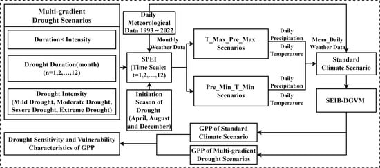 Using different time scales of specified SPEI values and drought characteristics, various drought scenarios’ daily precipitation and temperature data can be inversely derived based on standard climate state data. Ultimately, 3456 sets (2 extreme boundaries × 3 drought initiation seasons × 4 drought intensities × 12 drought durations × 12 SPEI time scales) of daily meteorological data under different drought scenarios were obtained and used to drive the model. We simulated GPP values under multiple drought scenarios, compared and analyzed GPP values under standard climate states with those under multiple drought scenarios, and elucidated the response mechanism of GPP under multiple drought scenarios.