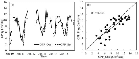 SEIB-DGVM localization results. (a) Timeseries of GPP_Est and GPP_Obs from 2010 to 2015; (b) scatter plot of GPP_Est and GPP_Obs from 2010 to 2015.