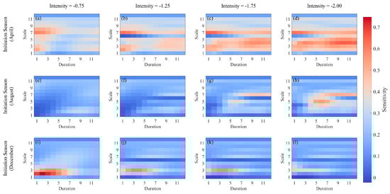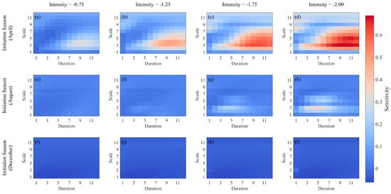 Under the Tmax and Premax scenarios, intensity = −0.75, initiation season in April (a); August (e); December (i). Intensity = −1.25, initiation season in April (b); August (f); December (j). Intensity = −1.75, initiation season in April (c); August (g); December (k). Intensity = −2, initiation season in April (d); August (h); December (l). The sensitivity of GPP varies with the duration of the drought and the SPEI time scale.
