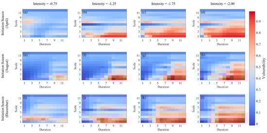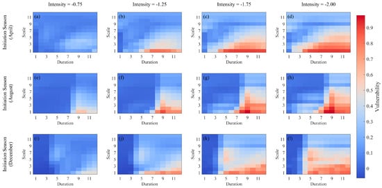Under the Tmax and Premax scenarios, intensity = −0.75, initiation season in April (a); August (e); December (i). Intensity = −1.25, initiation season in April (b); August (f); December (j). Intensity = −1.75, initiation season in April (c); August (g); December (k). Intensity = −2, initiation season in April (d); August (h); December (l). The vulnerability of GPP varies with the duration of the drought and SPEI time scale.