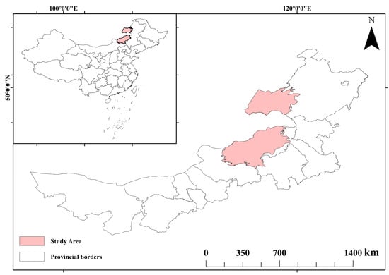 The study area is a typical grassland area in Inner Mongolia, located in the Xilingol League Prefecture near Hulunbuir City. The geographical range is 113°49′–120°26′ E, 43°08′–49°96′ N, the altitude ranges from 495–1577 m, the east–west length of the area is about 350 km, and the north–south width of the area is about 150 km, with a total grassland area of 152,521 km2 (Figure 1). The average temperature in the study area during the growing season is 17 °C, and the average precipitation in the growing season is 232 mm. The area is considered to have a northern temperate continental climate. The distribution of water resources is not balanced. There are more water resources in the eastern region, and most central and western regions are short of water resources. The cold wind in winter is strong, and both precipitation and temperature peak during the summer. The vegetation type in the study area is typical of the regional steppe, the dominant species being Stipa krylovii, S. grandis, and Leymus chinensis.