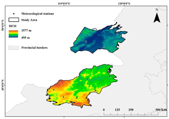 The meteorological station data used in this study are collected from stations evenly distributed across the northeast of the Inner Mongolia Autonomous Region. The monthly average temperature and monthly precipitation of 12 meteorological stations were used (Table 2). The monthly average precipitation is used to calculate SPI and SPEI, and the monthly average temperature is used to calculate SPEI. The above meteorological station data are from the Inner Mongolia Meteorological Bureau (Figure 2, Table 2).