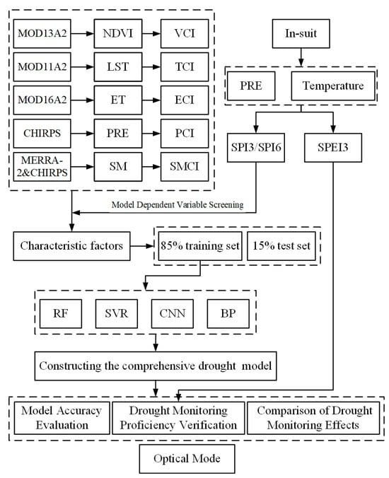 To comprehensively consider the combined effects of precipitation, vegetation, and soil on drought in the process of constructing the drought index, the five independent variables (VCI, TCI, ECI, SMCI, and PCI) and the dependent variable SPI3 were selected above. Based on the random forest model (RF), convolutional neural network model (CNN), support vector regression (SVR), and BP neural network, a comprehensive drought monitoring model with SPI = f (VCI, TCI, ECI, SMCI, and PCI) was constructed and named (CDMI). The coefficient of determination (R2) and root mean square error (RMSE) were used to evaluate the fitting accuracy of the comprehensive drought monitoring model. The data for the same month from 2001 to 2022 were divided into five groups, and the data for 22 months in each group were calculated. 85% of the total pixel number was set as the training set, and 15% was set as the test set for model training and validation. The flowchart for model construction is presented in Figure 3.