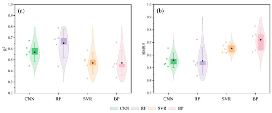 We observed that the R2 range of the comprehensive drought monitoring index based on the RF model ranged from 0.44–0.79, the R2 range of the CNN model ranged from 0.45–0.68, and the R2 range of the SVR model ranged from 0.33–0.59 (Table 13). The R2 range of the BP neural network model ranged from 0.31–0.60. Further, the comprehensive drought monitoring index has monthly scale differences. In all models, the model was the least accurate in September and most accurate in July. According to the comparison of R2 violin plots, it can be found that among the four machine learning models, the average R2 of the comprehensive drought monitoring index based on the random forest model is the highest, R2 > 0.60; the CNN model is second only to RF, 0.60 > R2 > 0.55; the accuracy of SVR is close to that of BP neural network, and the R2 range is between 0.4 and 0.5. The accuracy of the four models could be represented as RF > CNN > SVR ≈ BP.