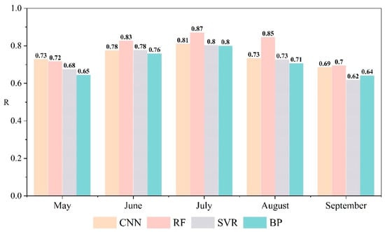 According to the analysis results, the correlation between the CNN model and SPEI in May is the highest, R = 0.73, followed by the correlation between RF and SPEI, R = 0.72, and then finally, the other two models wherein R < 0.7, suggesting low correlation. Among all models, the correlation between RF and SPEI3 in June–September is the highest. The Pearson’s correlation, R, in June–August for the RF model is greater than 0.8, and the other three models are significantly different from RF. In September, the correlation of all four models to SPEI was low, though RF was slightly higher than CNN, and both were significantly higher than the other two models. Except for May and September, the correlation coefficients in other months were higher than 0.8, and the above results all passed the 0.01 significance test. The results show that the comprehensive drought monitoring index based on RF can effectively improve the ability of models to simulate drought indices on a typical grassland area in Inner Mongolia [].