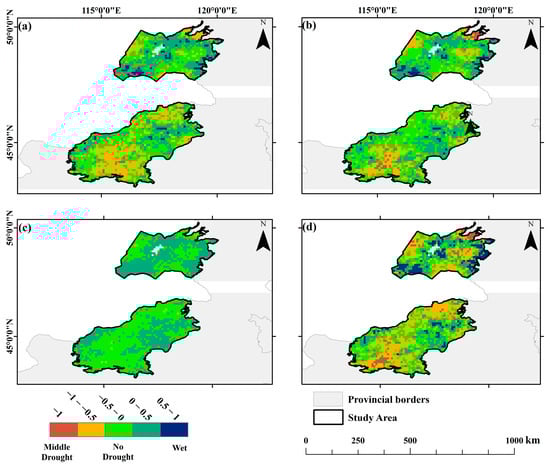 Among them, SM, SMmax, and SMmin are the monthly SM value, the multi-year maximum of monthly SM, and the multi-year minimum of monthly SM in the study time range, respectively. The range of SMCI is 0–1. The higher the soil moisture, the higher the SMCI value, and vice versa.