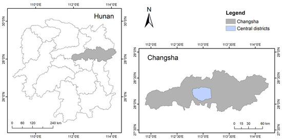 The city chosen for this study is Changsha (Figure 1). Changsha is the capital of Hunan Province, China. It has a typical subtropical monsoon climate, mountainous and hilly topography, hot summers, and many high-temperature days. Therefore, it is crucial to study the distribution particularities of the summer thermal environment spatial morphology in Changsha and the cooling effect of green city areas on the spatial morphology of the surrounding cities. Concurrently, this study focuses on exploring the relationship between green city areas and urban spatial form indicators, and thus selects a central area of well-constructed cities, the Changsha City Ring Road, as the research boundary to examine the core built-up areas within the third ring road of Changsha City.