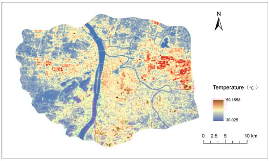 Presently, high spatial resolution remote sensing (RS) has been widely used in urban thermal environment research. Therefore, this study acquired research remote sensing data based on Landsat 8 series satellites (the longest-running Earth observation satellites), with a resolution of 30 m, captured in the summer when the UHI was significant, on 17 August 2019. Next, the remote sensing images were pre-processed using ENVI5. Three software packages for geometric correction, radiometric calibration, atmospheric correction, cropping, and other pre-processing were used to invert the surface temperature, then combined with the single-window inversion method for obtaining the surface temperature readings of downtown Changsha. Additionally, they were used to analyse the characteristics of the geographic distribution of the environmental temperature spatial morphology in the subtropical city of Changsha from the perspective of the spatial morphology at the surface. Figure 2 illustrates Changsha’s surface temperature inversion data on 17 August 2019.