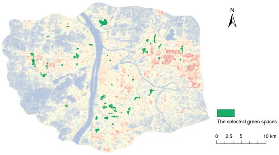 The cooling effect of green city areas is affected by the diversity and complexity of the environment in which they are located; therefore, when selecting the green areas in Changsha city center as a sample, we aimed to select the patches with significant differences in the shape of the green city areas as much as possible, to better study the role of green city areas in reducing temperature and analyse the influencing factors. Therefore, the normalised vegetation index (NDVI) was used to extract urban green patches; it is the most accurate indicator of plant development status and vegetation cover. It is frequently used to detect plant development status and cover and remove localised radiation errors [33,54,55]. Meanwhile, to eliminate cooling impact relationships between green areas or between green areas and water bodies and to increase the analysis’s trustworthiness, we referred to the screening conditions for green city areas in related papers [56,57], with the establishment of the following rules for the selection of urban green area examples based on high-resolution Google Earth imagery, as Figure 3 illustrates: (1) green area samples were chosen to vary in size from their current state; (2) the vegetation cover of the sample of green areas chosen should be greater than 80%; and (3) the samples of green areas chosen have no water bodies within them and should be over two hundred meters distant from additional green areas or water bodies. Finally, because this study focused on urban spatial morphology indicators, greenspace samples far from the built-up areas of urban centres were excluded based on a visual explanation of the corresponding high-resolution Google Earth satellite images and field surveys of subsurface characteristics. Based on these principles, a total of 40 green areas in city samples satisfying the requirements of this study were screened, and the geographic distribution maps of the green area samples in Changsha were created by superimposing the green city areas sample boundary maps with the surface temperature inversion maps (Figure 4).