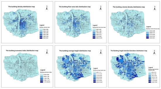 This study focuses on quantifying urban spatial morphology indicators on the green areas’ cooling effect, due to the correlation between many spatial morphology indicators to comprehensively and thoroughly reflect the characteristics of urban spatial morphology and to reduce redundant information. Referring to previous studies and relevant concepts based on urban form indicators [58,59,60], six urban spatial morphology indicators were selected to express the urban spatial morphology around the green city areas in Changsha (Table 1). They include building density (BD), building floor area ratio (BFR), building volume density (BVD), building evenness index (BEI), building average height (BH), and building height standard deviation (BSD). In addition, the relative positions of the buildings were considered. These indicators can comprehensively reflect the spatial morphological characteristics of the city and can be used as adjustment objects for mitigating urban heat islands. Simultaneously, the three-dimensional spatial information of Changsha City Centre was obtained through the Baidu map and combined with field measurements and the city street map, including city streets, building heights, BD, BFR and other urban spatial data, and the distribution of urban spatial morphology Indicators in Changsha City Centre was mapped in ArcGIS (Figure 5); ESRI, Redlands, CA, USA.