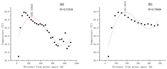 In the present study, the cooling distance of green city areas is the maximum distance that the green areas can mitigate the UHI. In contrast, the cooling magnitude of green city areas is the difference in temperature within the cooling distance of the green areas, and these two data are important indicators for assessing the cooling effect of green city space. It would depend on the resolution of the remote sensing satellite images used in the study and the magnitude of the green city areas; firstly, 10–30 buffer zones were established at 30-metre intervals starting from the edges of selected green city area patches. Next, the change rule of the temperature within 300–900 m of the green city areas was summarised by overlaying the above surface inversion temperature dispersion map with the buffer zones. Finally, we calculated the average surface temperature of each annular buffer to fit a cubic function to the cooling distance versus the average temperature. As Figure 6a illustrates, in terms of cooling distance and average temperature, the cubic function law is demonstrated by the fitted results. With the increase in cooling distance, the cubic polynomial curve shows a tendency of rising, then falling, and then rising, which rises and falls obviously in the first 480 m cooling distance. At the same time, it shows irregular changes in the last 480 m cooling distance, and its overall fitted R2 value is 0.72539.