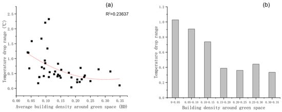 According to Table 2, the Pearson correlation coefficient between the mean BD and cooling range of the 40 greenfield samples was −0.458 (P = 0.003 < 0.01), which indicated that they showed a significant negative correlation. To explore the specific morphology of change, next, the average BD value within the maximum cooling distance of each greenfield sample was calculated and combined with the cooling range of each greenfield sample as mentioned above, and the fitting analysis was performed, with the average BD value as the dependent variable and the temperature drop range as the independent variable. The results prove that, as shown in Figure 7a, the higher the building density, the lower the cooling range, and the relationship between them can be described by fitting the curves with a quadratic polynomial. This phenomenon suggests that the increase in building density causes the reduction in the magnitude of temperature drop, while the next step is to quantitatively analyse the specific range of values.