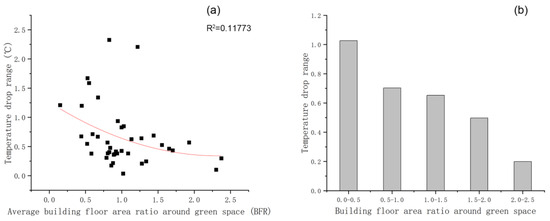 To ascertain the precise range of building floor area ratio (BFR) in the vicinity of green areas that promotes a cooling effect, we employed BFR as the basis for classification. We partitioned all samples into five groups based on intervals of 0.5 and then counted the average temperature drop range of the buffer zone around each group of green areas and derived the statistical findings presented in Figure 8b. According to the results, temperatures in the buffer area surrounding the green areas are the lowest, exceeding 1.0 °C, when the BD falls within the range of 0.0 to 0.5. Therefore, this study proves that the smaller the building floor area ratio, the better the cooling effect brought by its green areas.