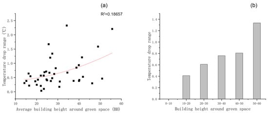 According to Table 2, the Pearson correlation coefficient between the mean BH and cooling range of the 40 greenfield samples was 0.426 (P = 0.006 <0.01), which indicates that they show a significant positive correlation. To explore the specific morphology of change, next, the average BH value within the maximum cooling distance of each greenfield sample was calculated and combined with the cooling range of each greenfield sample as mentioned above, and the fitting analysis was performed, with the average BH value as the dependent variable and the temperature drop range as the independent variable. The results prove that, as shown in Figure 9a, the higher the average height of buildings, the stronger the cooling range and the relationship between them could be described by the curves fitting to a quadratic polynomial. This phenomenon suggests that the increase in the magnitude of temperature drop is attributed to the increase in the average height of buildings, while the next step is to quantitatively analyse the specific range of values.