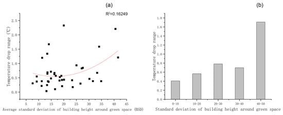 To ascertain the precise range of the building height standard deviation (BSD) in the vicinity of green areas that promotes a cooling effect, we employed BSD as the basis for classification. We partitioned all samples into five groups based on intervals of 10, and then counted the average temperature drop range of the buffer zone around each group of green areas and derived the statistical findings presented in Figure 10b. According to the results, temperatures in the buffer area surrounding the green areas are the lowest, exceeding 1.7 °C, when the BSD falls within the range of 40 to 50. Therefore, this study proves that the bigger the building height standard deviation, the better the cooling effect brought by its green areas.