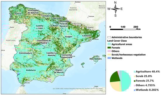 The study areas comprise all autonomous communities of Spain with the exclusion of the Canary Islands territory (UTM projection of ETRS89, latitude of 40.4637° N, and longitude of 3.7492° W). Therefore, the remaining total land area of the study site was approximately 498,497 km2. Figure 1 depicts the study area and land cover distribution map of Spain and the percentage of each land cover type across the country. The climate of the Iberian Peninsula of Spain varies considerably. It is characterised by moderate winter cycles, extremely drier and unbearably hot in the summer period, and wetter and cooler in the mountain areas. Annually, the average temperature ranges from 0 °C to 18 °C, annual precipitation ranges from 150 mm to 2500 mm, and the average wind speed is 7.9 miles per hour. As of the end of 2020, the demographic population density of Spain is estimated to be 66,229,715 people, with Andalucia having the highest population density of approximately 11,796,105 people residing in the region. Within study periods, our study discovered 3430 fire events, and these events damaged more than 867,500 hectares caused by wildfires between 2008 to 2021. Notably, 266 wildfires were reported in 2012, resulting in the loss of 178,504 hectares of land. In addition, when considering land cover types, about 257 fires occurred in 2017, destroying around 112,892 hectares of scrub/herbaceous vegetation.